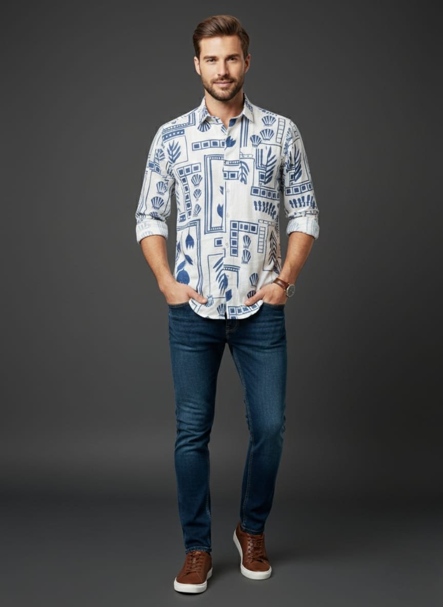 Bring fresh style to your wardrobe with this contemporary blue-on-white geometric print shirt. Crafted from high-quality blend cotton twill fabric, it offers both comfort and structure. The discharge print ensures crisp, fade-resistant patterns that maintain their charm even after multiple washes.