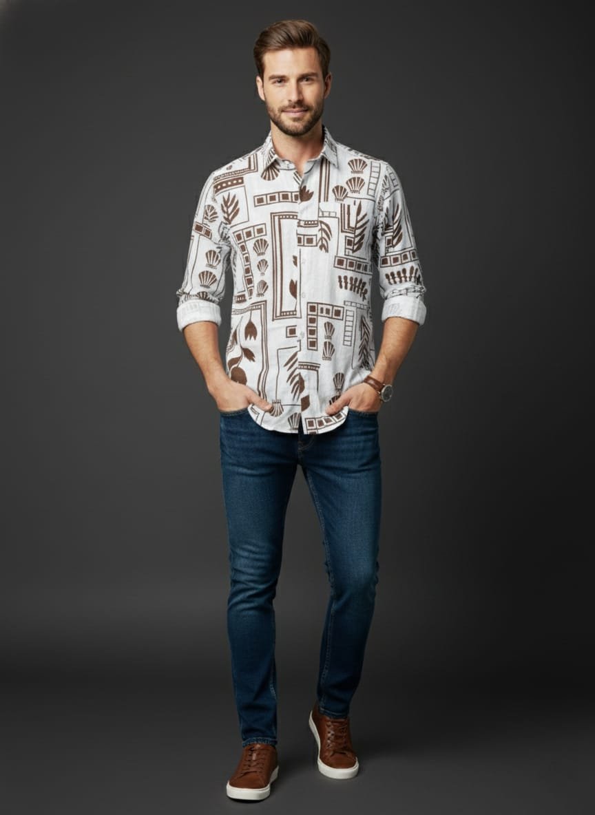 A warm-toned take on the same modern pattern, this coffee brown printed shirt delivers effortless elegance with a touch of earthy tone. The twill cotton blend feels smooth on the skin and offers excellent breathability for all-day comfort.
